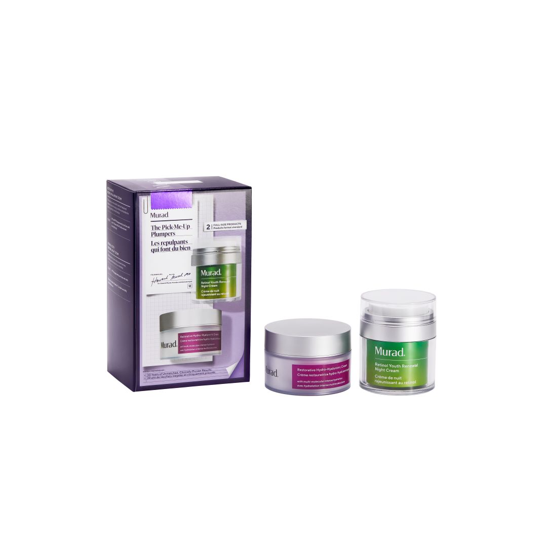 Το The Pick-Me-Up-Plumpers από τον Dr. Murad περιέχει την Retinol Youth Renewal Night Cream μια προηγμένη αντιγηραντική κρέμα ρετινόλης για όλους τους τύπους δέρματος και ως δώρο την Restorative Hydro-Hyaluronic Cream μια πλούσια ενυδατική κρέμα με υαλουρονικό οξύ.